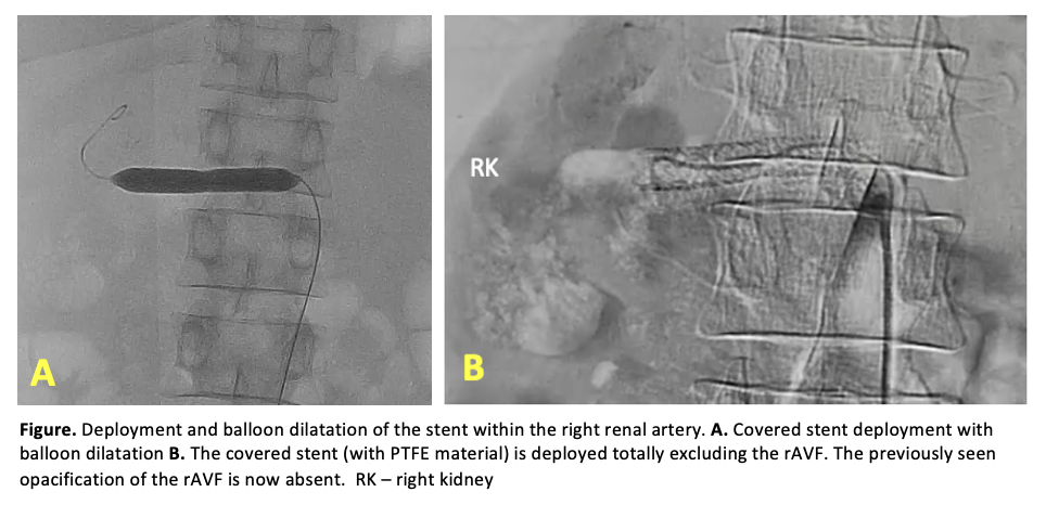 Intervention to interrupt the shunt that is diverting blood flow to the inferior vena cava and causing high output heart failure was necessary. Surgical treatment such as nephrectomy or renal artery ligation, known to be standard treatments, were deemed high risk procedures in our patient that has a prohibitive cardiac status. Transcatheter coil embolization, the most commonly used intervention, was also not an option in this case due to the presence of a large fistula which increases the risk of coil migration and embolic events. Hence, after shared decision making, percutaneous renal angioplasty was done using a 9mm Advanta PTFE balloon-expandable covered stent to exclude the fistula and interrupt the shunt. With the patient already on an anticoagulant (apixaban) for atrial fibrillation, a single antiplatelet (aspirin) was started. Heart failure medication regimen for the reduced EF was continued. 5 months after, there was significant clinical improvement with resolved edema and increased exercise tolerance. EF improved from 21% to 49%. Surveillance renal duplex scan revealed significantly elevated velocities within the stent suggestive of in-stent stenosis. This was an anticipated and accepted complication of the intervention, as the ultimate goal was alleviation of central volume overload and not restoration of renal perfusion. The patient remains well and euvolemic.