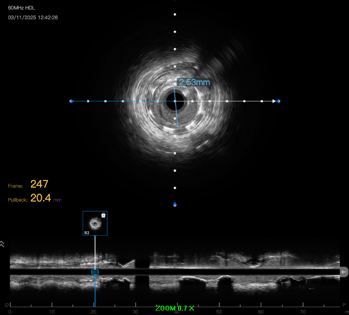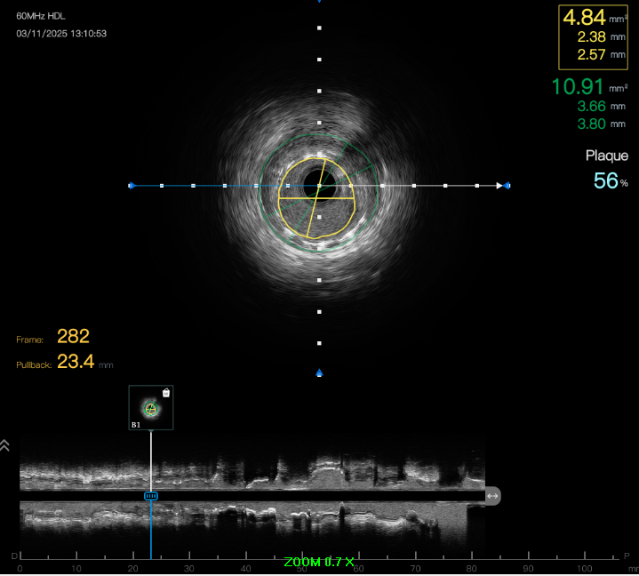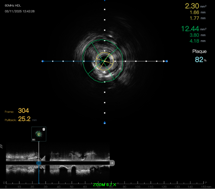 Predilation was challenging due to poor support. Initial 0.75 mm balloon could not pass; support was augmented with Sion Blue to RV branch. Subsequent predilation was performed sequentially with Zinrai 0.75 ¡¿ 4 mm, Ryureo 1.0 ¡¿ 5 mm, and NC balloon 2.0 ¡¿ 15 mm, achieving satisfactory antegrade flow. IVUS assessment demonstrated a distal vessel diameter of 2.5 mm, proximal/mid 3.5 mm, previous MSA 3.5 mm, and 360¡Æ proximal calcium. Additional predilation using Wedge 2.5 ¡¿ 15 mm (distal¡æproximal) and Scoreflex 3.0 ¡¿ 15 mm (mid¡æproximal) resulted in <30% recoil and no dissection. Post-IVUS, MSA improved from 3.5 ¡æ 4.8 mm.