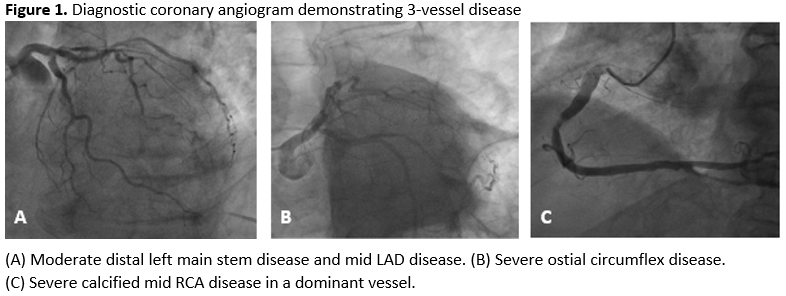 A 79-year old male with hypertension and moderate left ventricular impairment was admitted to hospital with a non-ST segment elevation myocardial infarction (NSTEMI). A diagnostic angiogram showed severe right coronary disease with moderate disease in the left coronary system (Figure 1a - 1c). The patient was transferred to our tertiary centre for complex percutaneous coronary intervention (PCI) to the culprit right coronary artery (RCA) with calcium modification and intravascular imaging (IVI).