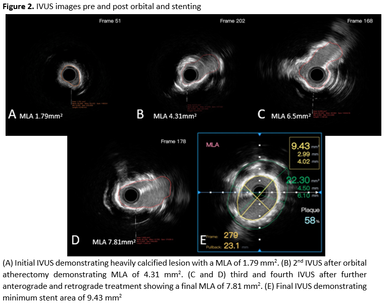OA was performed at low speed and was tolerated well by the patient. Subsequent IVUS demonstrated an improvement in MLA to 4.31 mm2 (Figure 2b). Two further runs (both low and high speed in antegrade and retrograde direction) were performed with IVUS assessment undertaken after each run. There was a further increase in MLA with calcium fractures seen on IVUS (Figure 2c & 2d). The lesion was then modified with a 4.00 mm non-compliant (NC) balloon prior to deployment of a 5.00 x 24 mm Megatron stent, which was post-dilated with a 4.50 mm NC balloon. The final angiographic result was satisfactory. The final IVUS showed good stent apposition, no edge dissection, and a minimal stent area (MSA) of 9.43 mm2 (Figure 2E).
