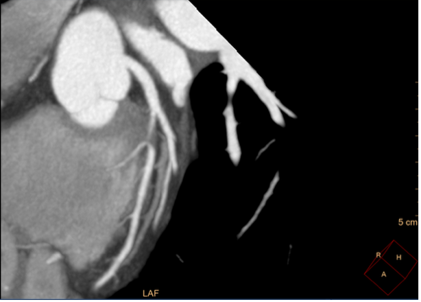 Coronary computed tomography angiography (CCTA) revealed a focal lesion stenosis in the mid-left anterior descending (LAD) artery, without significant disease in the remaining coronary vessels. Based on these findings, the patient was diagnosed with stable angina and referred for invasive coronary angiography to further characterize the lesion and determine the optimal revascularization strategy.