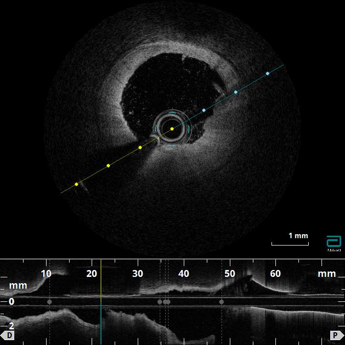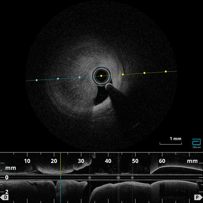 Coronary angiography confirmed a hemodynamically significant stenosis in the mid-LAD, consistent with CCTA. OFDI revealed a high-intensity, heterogeneous signal with layered structure and microchannel formation, features suggestive of an organized thrombus rather than a lipid-rich atherosclerotic plaque. This morphology was considered to be associated with a low risk of plaque restenosis and favorable balloon response, making a stent-free strategy a reasonable therapeutic option.