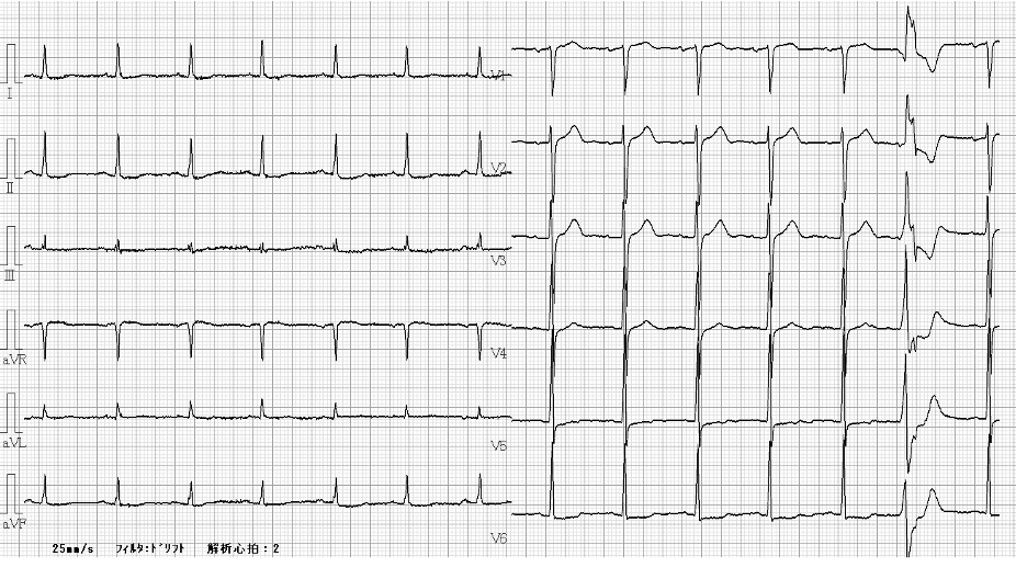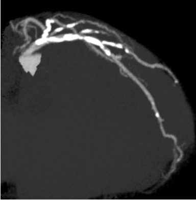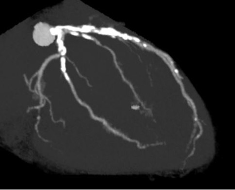 Resting ECG showed ST-segment depression in leads V5–V6. Echocardiography demonstrated preserved left ventricular systolic function with an ejection fraction of 67%. Laboratory tests showed normal renal function and a normal BNP level. Coronary CT angiography revealed severe calcification in both the LAD and left circumflex arteries.