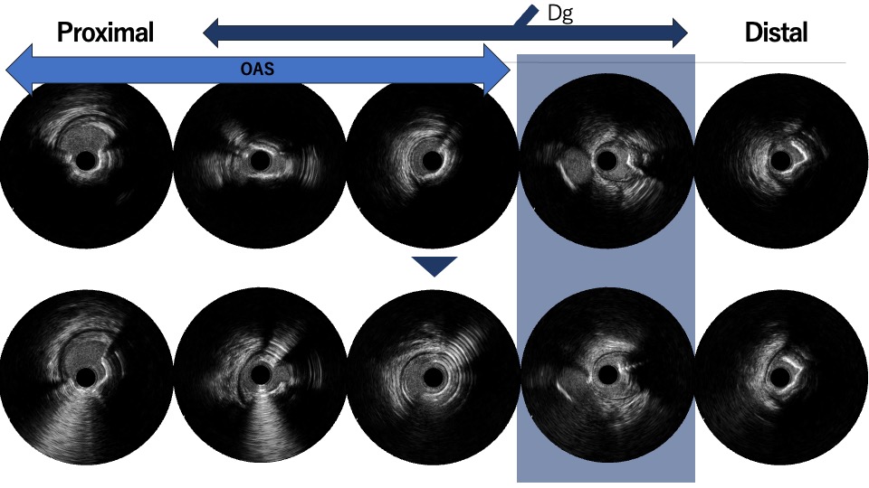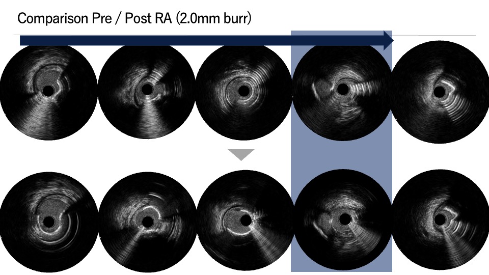 PCI was first performed for the LCx, using orbital atherectomy followed by cutting balloon predilatation and drug-coated balloon therapy with good angiographic result. One month later, PCI was attempted for the LAD lesion using a 8F system via right femoral approach. Intravascular ultrasound (IVUS) revealed a diffusely eccentric calcified plaque located on the septal side. While wire bias in the proximal segment was toward the calcified plaque, the distal segment showed tenting of the wire toward a plaque-free site on the diagonal branch side. At this point, we considered that debulking of the distal segment would be a high risk of vessel injury. We hypothesized that performing proximal segment debulking that had a favorable wire bias might shift the overall wire bias toward the septal side. Then Only proximal OAS was performed using pull-back ablation.Follow-up IVUS showed disappearance of distal tenting and favorable wire bias toward the calcified plaque. As a result, OAS was safely performed in the distal segment as well. Additional debulking of the residual calcified plaque was conducted with a 2.0 mm Rotablator. IVUS confirmed effective debulking without vessel injury in the area of concern. The entire lesion was then dilated with a CB; however, a dissection with hematoma occurred, and a drug-eluting stent (DES) was implanted. Final IVUS demonstrated acceptable stent expansion, and final angiography showed no residual stenosis or flow limitation.