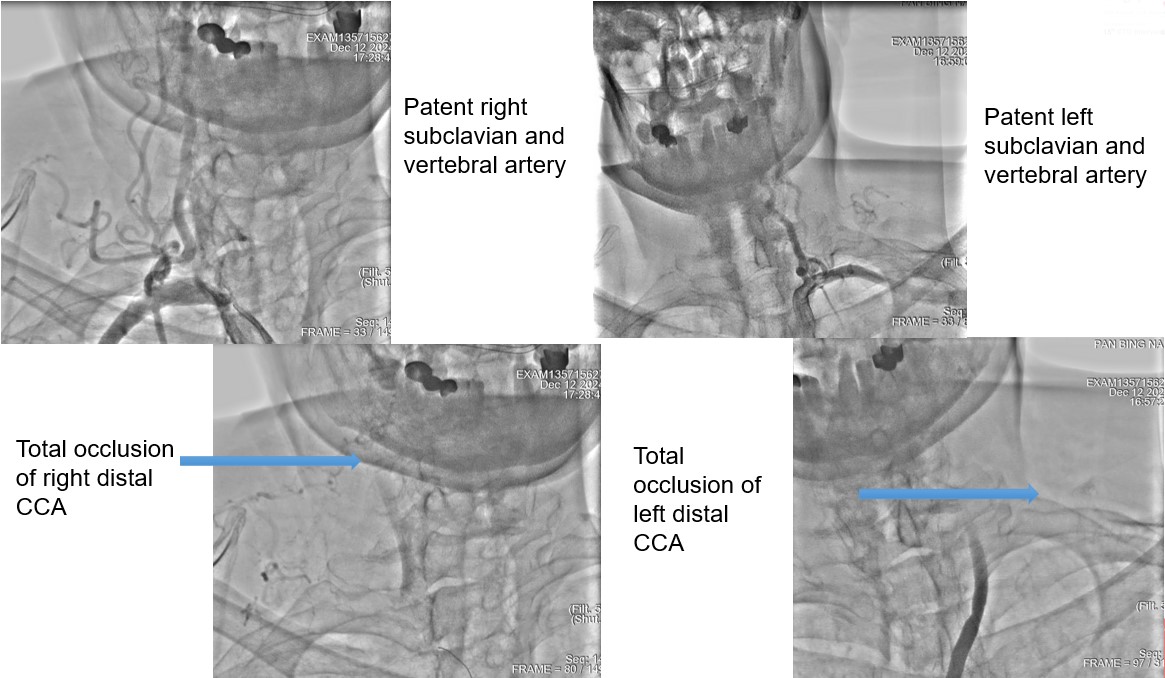 Carotid angiography showed bilateral CCA occlusion with bridge collaterals from vertebral and subclavian artery. Patient refused surgical endarterectomy. Lower limbs angiography revealed right SFA CTO, left SFA distal stenosis.We tried endovascular treatment for left CCA occlusion first but failed.