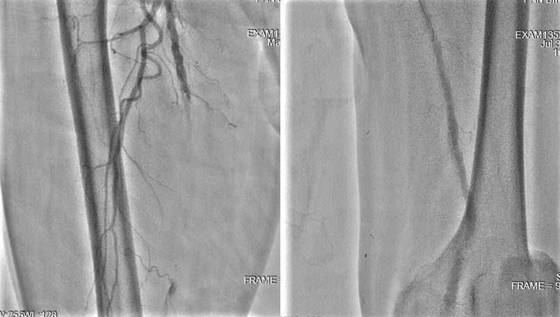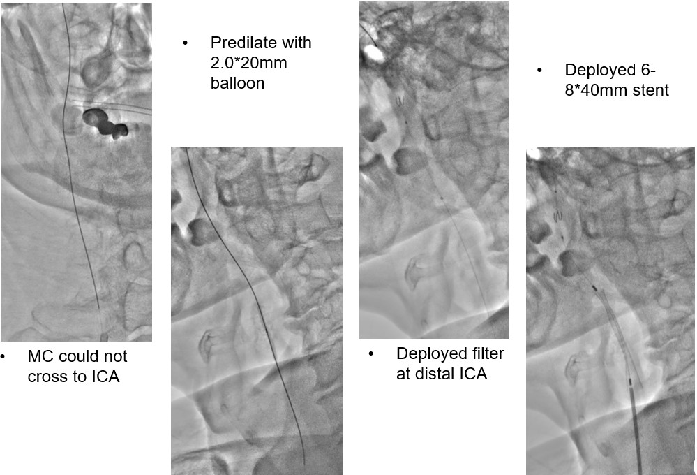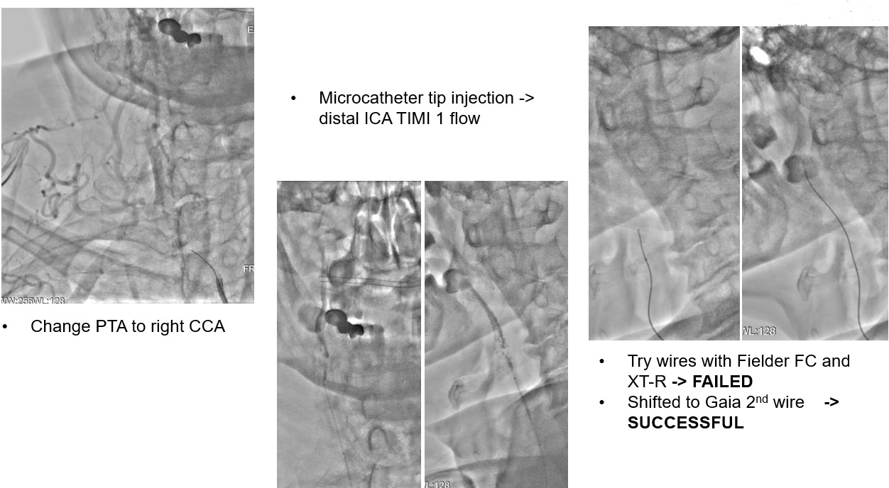 We tried wiring to left ICA occlusion with microcatheter first but failed.Then we tried PTA for right CCA occlusion. With microcatheter support, Gaia 2nd wire advanced to right ICA difficultly2.0mm small balloon pre-dilateddistal filter placement then carotid stenting smoothly.Patient symptoms improved dramatically and discharged 4 days later.We tried elective PTA for right SFA CTO by bilateral puncture approach. Antegrade from left transfemoral cross over sheath, and retrograde from right POPA.Antegrade failed wiringThen retrograde wire successfully advance to antegrade microcatheter -> Rendezvous -> externalization -> balloon pre-dilate and stenting