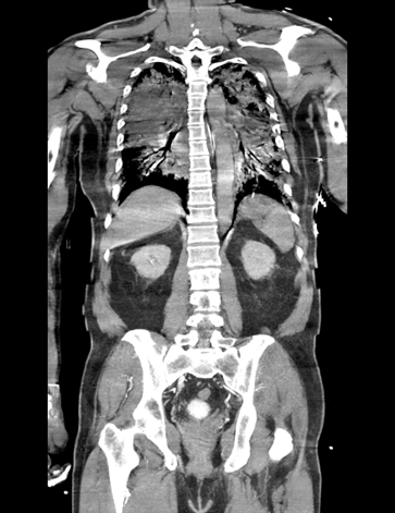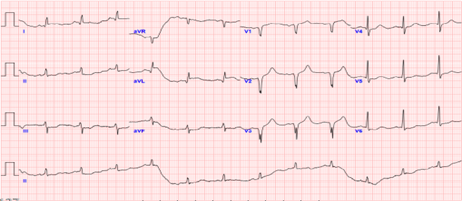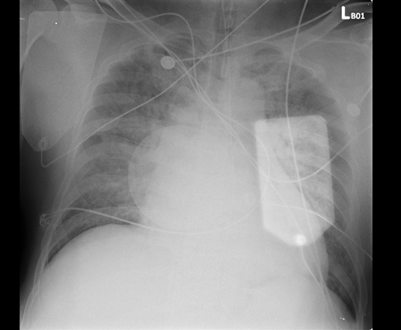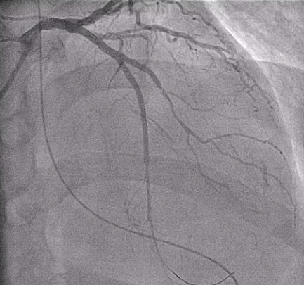 A 60-year-old man with poorly controlled hypertension and a history of cigarette smoking suffered a witnessed out-of-hospital cardiac arrest. The initial rhythm was ventricular fibrillation requiring CPR and multiple defibrillations, with ROSC after ~40 minutes. On arrival, he was intubated and in cardiogenic shock with pulmonary edema. He was stabilized with VA-ECMO, IABP, and mechanical ventilation before coronary angiography.