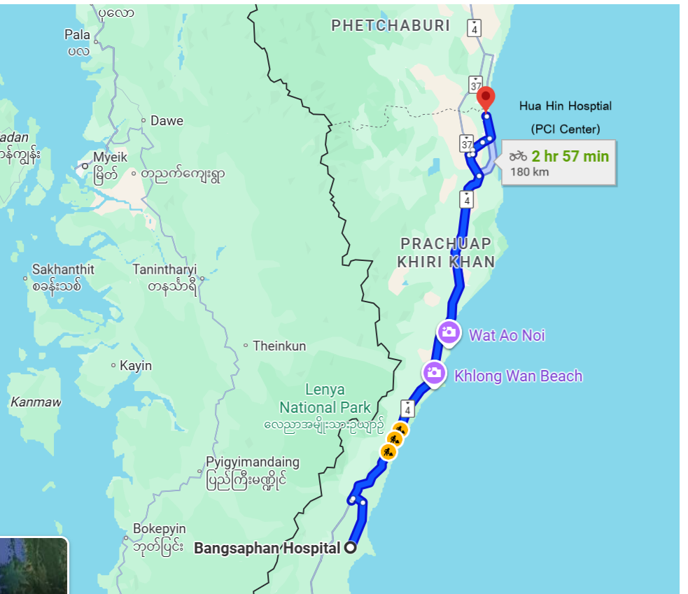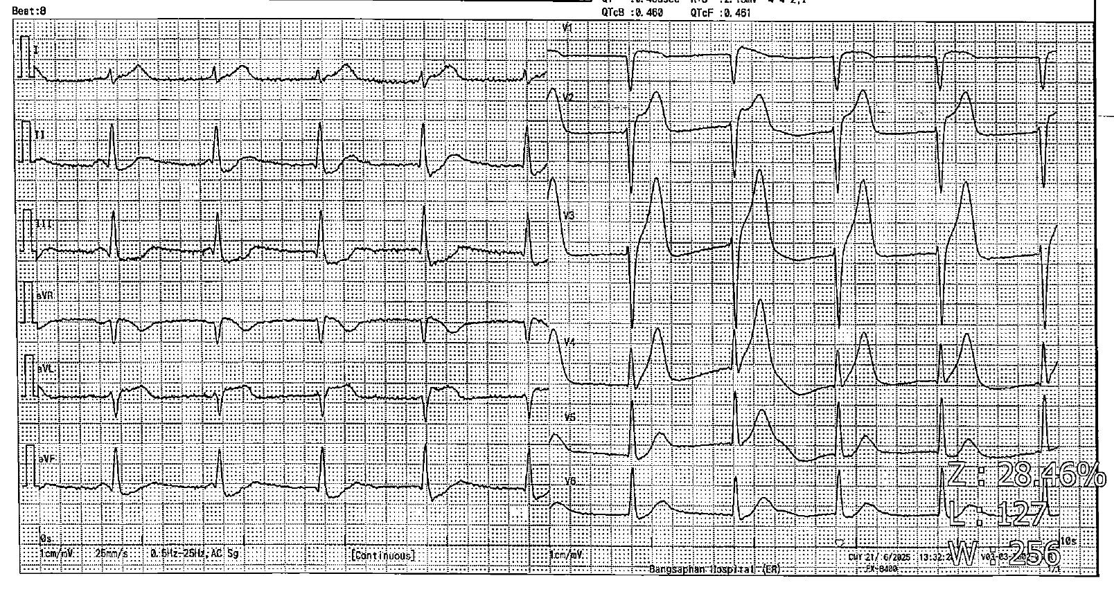 Initial ECG showed sinus rhythm with marked ST-segment elevation in V2–V3 and reciprocal depression in leads II and III. Because the hospital was 180 km from a PCI center (refer time 3 hours), streptokinase (1.5 million units) was initiated. Five minutes after infusion (~250,000 units), the patient developed ventricular fibrillation, successfully defibrillated, intubated, and transferred. CT brain showed no intracranial hemorrhage.