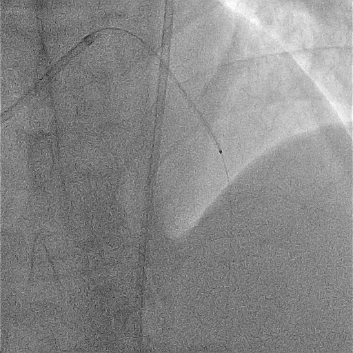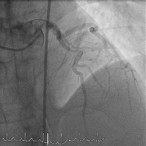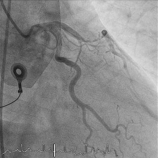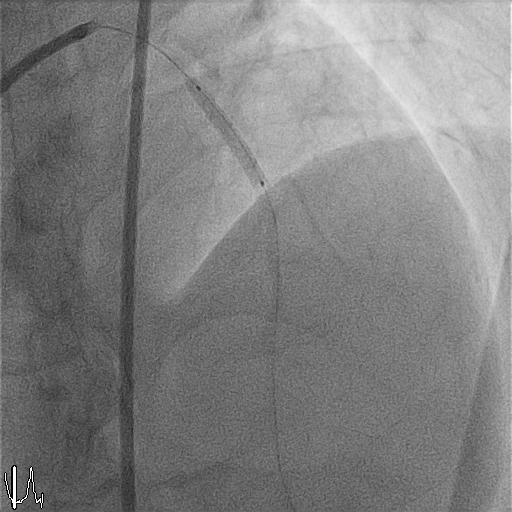 The patient arrived intubated and hemodynamically stable. Right femoral artery access was obtained with a 7 Fr sheath. Diagnostic angiography confirmed subtotal thrombotic occlusion of the proximal LAD with TIMI 1 flow and a large thrombus burden. PCI was initiated using a 7 Fr EBU 3.5 guiding catheter and a Sion guidewire. An ELIMINATE 7 Fr aspiration catheter was advanced, and multiple aspiration passes were performed, but significant residual thrombus persisted with high risk of no-reflow.