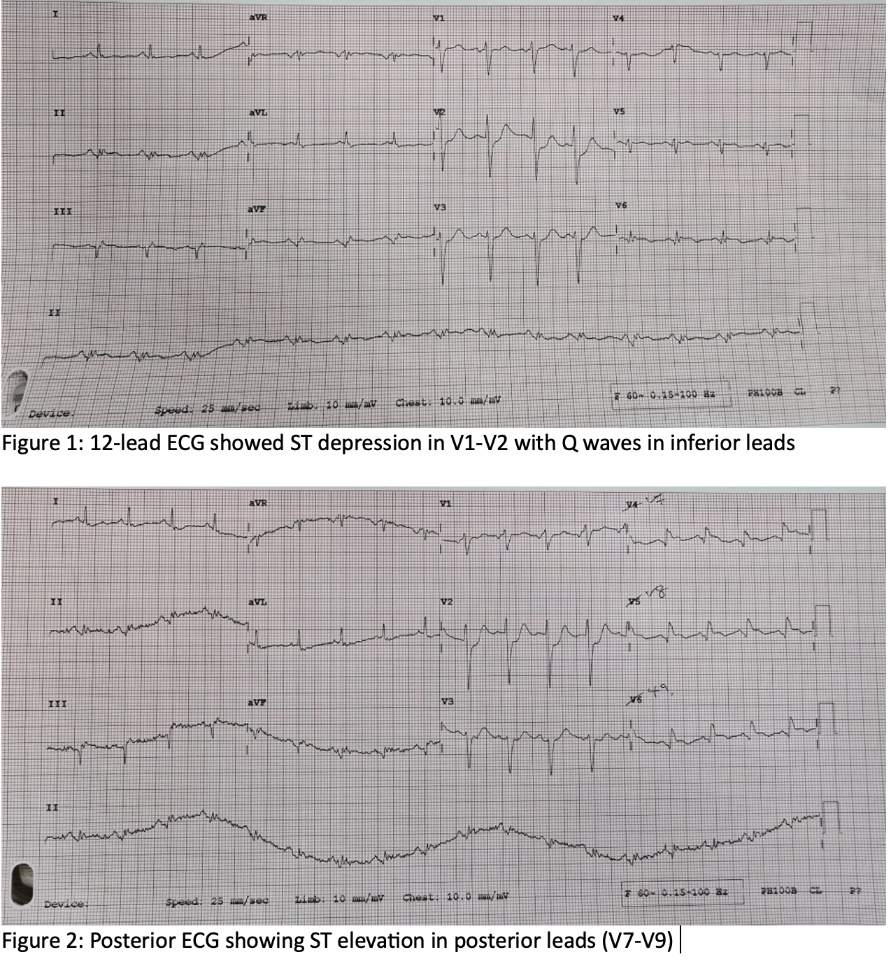 69-year-old gentleman with type 2 diabetes, hypertension and hyperlipidemia, with prior unstable angina and cardiac MRI showing near-transmural basal inferior and anterolateral infarcts, presented after two days of lethargy and fever with new onset chest pain. He was stable with no acute heart failure, but electrocardiogram showed posterior ST elevation with anterior (V1-V2) depression and inferior Q waves, consistent with posterior ST Elevation myocardial infarction (STEMI).