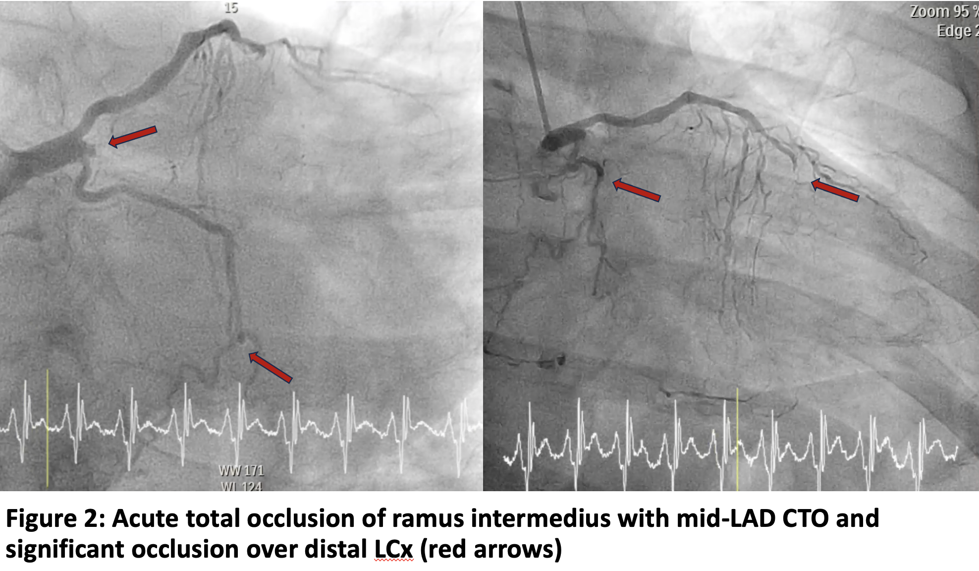 - LM - normal - LAD - mid-LAD chronic total occlusion (CTO)- LCx - Non-dominant with distal CTO- RCA - Dominant with ostial CTO- Ramus intermedius - ostial acute total occlusion (ATO)