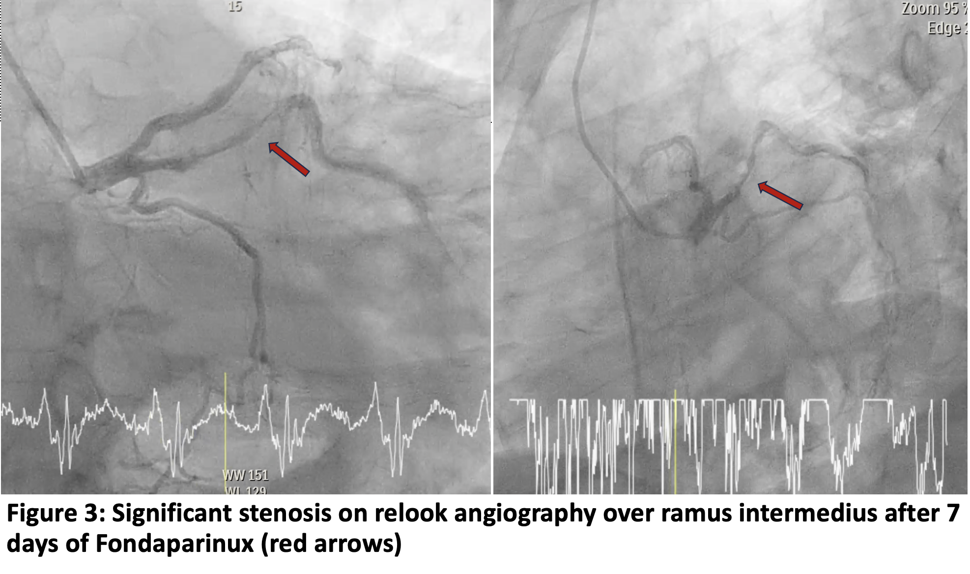 Coronary angiography of the left and right coronary arteries was performed via right radial artery using a 5 Fr Tiger catheter in multiplane views. Primary PCI to the ramus intermedius was attempted with a 6 Fr XB 3.0 guider with side hole and a Runthrough wire. The lesion could not be crossed, so the wire was exchanged with Fielder XT, which successfully crossed without perforation. Pre-dilatation with a MINI TREK 2.0 x 15mm non-compliant (NC) balloon at 14-16 atm. Thrombus aspiration was performed with a THROMBUSTER 6 Fr catheter retrieved white and red intracoronary thrombi, but TIMI flow remained 1. Additional NC balloon dilatation was done with a MINI TREK 2.5 x 15mm (proximal 10 atm, distal 4 atm). Repeat aspiration was done using GUIDEPLUS guide extension achieving TIMI 3 flow with no dissection and perforation. Patient remained stable and was transferred to the coronary care unit for monitoring and seven days of Fondaparinux with dual antiplatelet therapy.