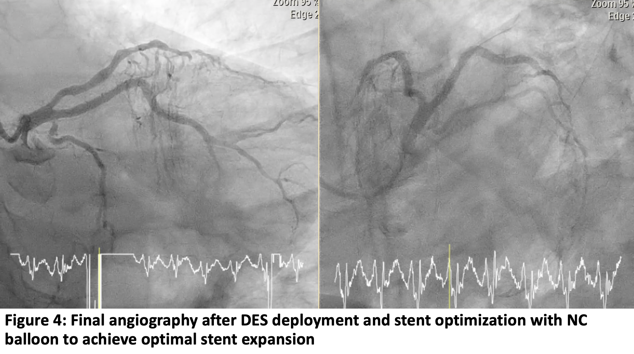 A relook coronary angiography was performed after seven days, followed by ad hoc PCI. A Runthrough wire was advanced via a 6 Fr XB 3.0 guider with side hole. Sequential pre-dilatation with NC Euphora 2.5 x 15mm balloon (8-12 atm) showed minimal recoil and no dissection. A drug-eluting stent (SMT Supraflex Cruz 3.0 x 48mm) was deployed from the ostial to mid ramus at nominal pressure, followed by post diltation with NC Sapphire 3.0 x 10mm at 24 atm. Final angiography: TIMI 3 flow, good expansion, no dissection.