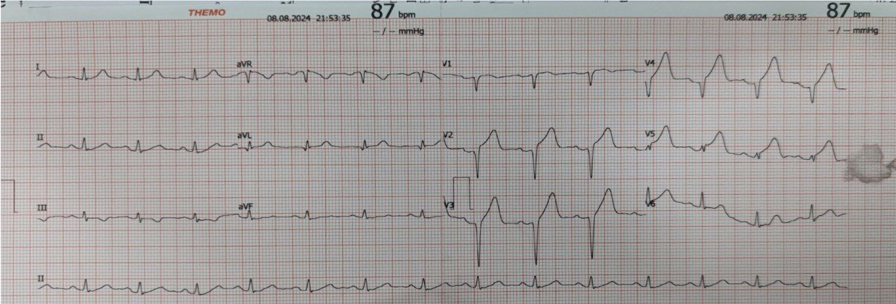 ECG showed ST elevation V1 to V5. Heart ultrasound revealed low LVEF 30-35%.