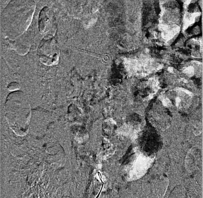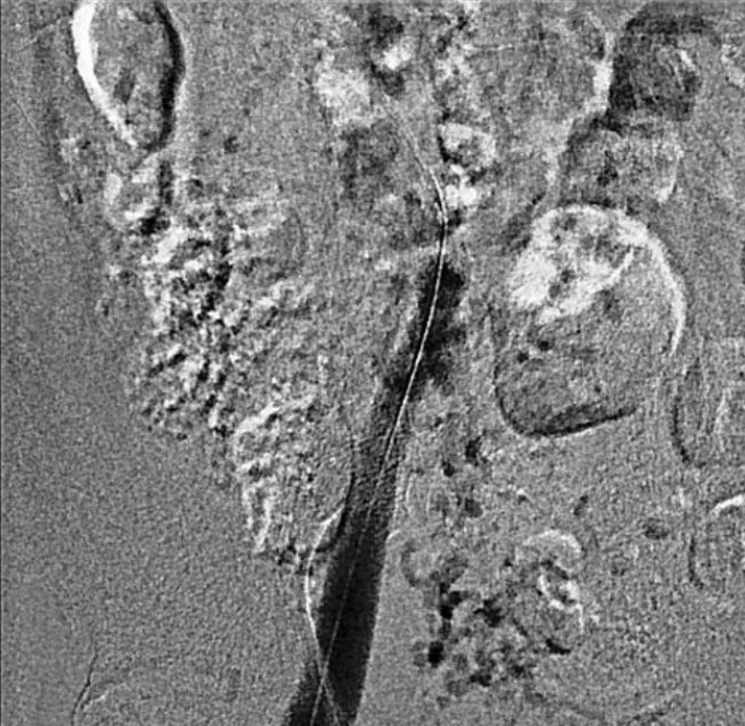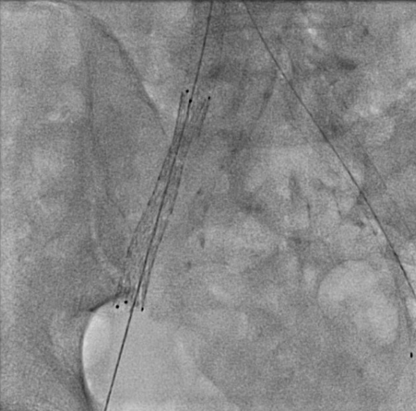 Carbon dioxide venography revealed patent right popliteal and femoral veins, with total occlusion of the right external and common iliac veins with collateral vein from femoral vein to IVC. The left iliac-femoral stent showed no in-stent restenosis but was positioned from the contralateral wall of the IVC, covering the right iliac vein ostium.