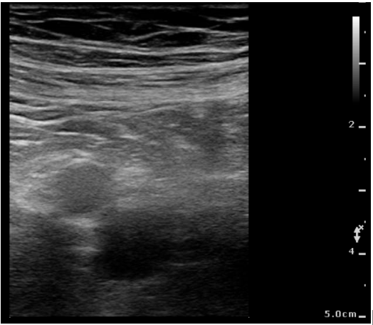 D-dimer was markedly elevated at 5.02 mg/L FEU. Laboratory data showed Hb 11.7 g/dL, PLT 167 K/¥ìL, WBC 6.73 K/¥ìL, and serum creatinine 2.10 mg/dL. Bedside POCUS demonstrated a non-compressible right femoral vein containing a floating thrombus. CT venography was deferred due to renal dysfunction. Right lower limb edema remained controlled under enoxaparin therapy.