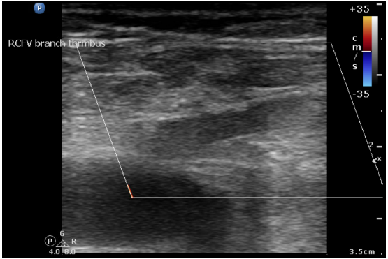A 84 year-old man with prior left-leg DVT treated by EKOS thrombolysis and iliac-femoral stenting, who had self-discontinued rivaroxaban for 6 months, and with comorbid hypertension, diabetes, CKD stage 3, and dyslipidemia, presented with acute right lower-limb pain, swelling, and erythema limiting ambulation. Vitals: BP 98/49 mmHg, PR 74, RR 18, SpO©ü 96%, BT 36.7 ¡ÆC. Examination revealed right-leg edema and calf tenderness, concerning for recurrent DVT.
