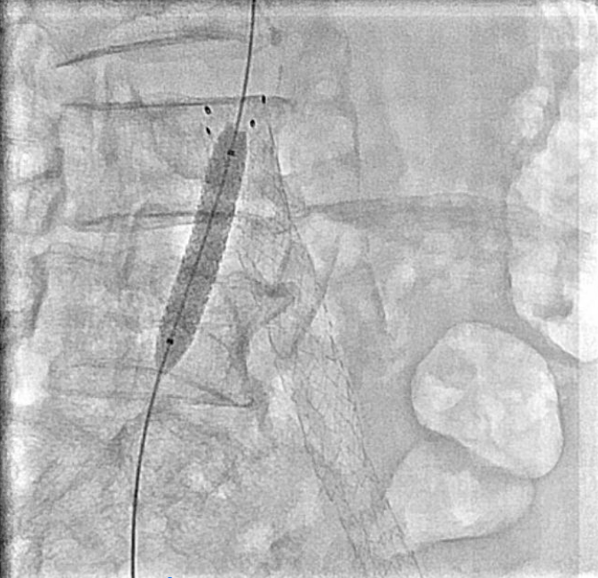 The patient achieved rapid clinical improvement with resolution of limb edema and remained free of recurrence under oral anticoagulation at follow-up.This experience highlights that in cases where conventional double-barrel iliocaval reconstruction is technically unachievable due to prior stent endothelialization or anatomic limitation, cross-strut recanalization combined with balloon-expandable stent implantation and kissing balloon angioplasty provides a feasible and durable alternative for iliocaval revascularization.