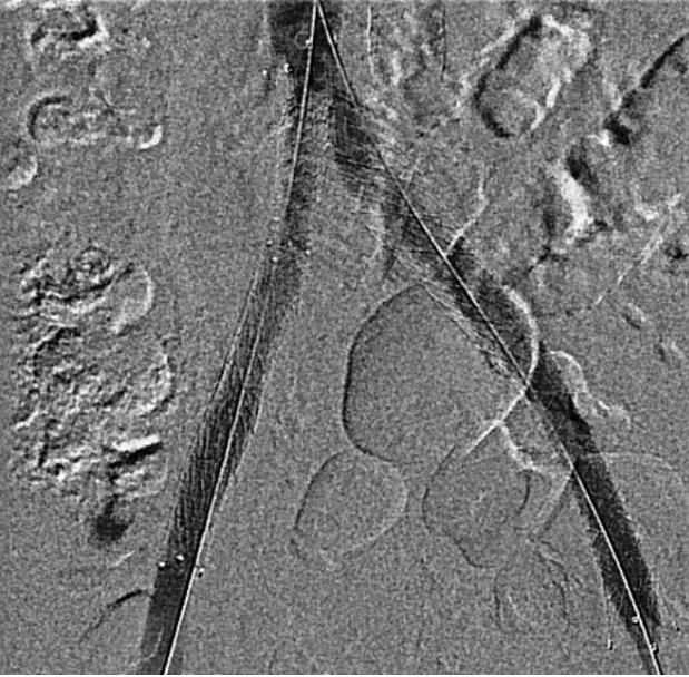 Venography showed occlusion of the right external and common iliac veins with collateral flow; popliteal and femoral veins were patent. A 6F sheath was placed in the right CFV, and a V-18 0.018 wire was advanced to the IVC. Attempts to traverse outside the prior left iliac-femoral stent for double-barrel reconstruction were unsuccessful, as the wire repeatedly entered the existing stent, likely due to complete apposition.The strategy was revised, and wiring into the IVC through a proximal stent strut was achieved. IVUS from the IVC to the RCFV confirmed severe compression at the right CIV ostium and proper wire position. A 10 ¡¿ 39 mm Abbott Omnilink balloon-expandable stent was deployed at the RCIV ostium and dilated to 10 atm. A kissing-balloon angioplasty was then performed with a 12 ¡¿ 40 mm Armada balloon from the LCIV and the RCIV balloon inflated simultaneously to 10 atm, restoring bifurcation geometry.A 14 ¡¿ 60 mm Bard Venovo stent was placed from the RCIV to the REIV and post-dilated with a 12 mm balloon to 10 atm. Final angiography showed widely patent, well-expanded stents with brisk antegrade flow into the IVC and no residual stenosis or thrombosis. Hemostasis was achieved with manual compression, and the procedure concluded without complications.