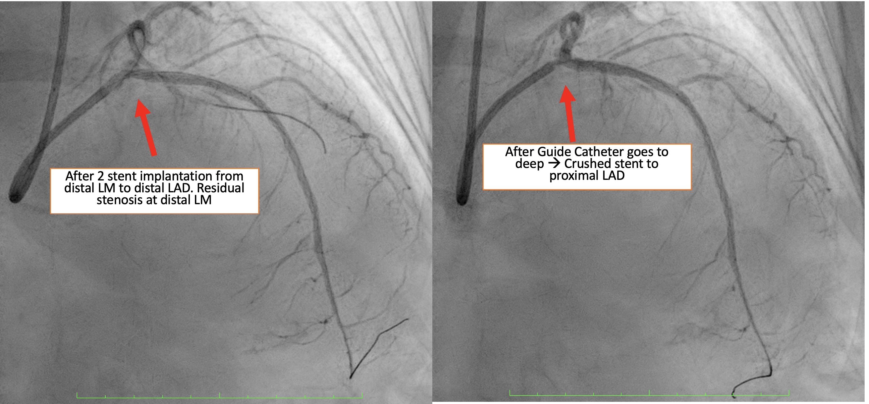 Based on angiographic and IVUS findings, the lesion was prepared using a scoring non-compliant (NC) balloon (ScoreFlex) 2.5 mm ¡¿ 15 mm, inflated from the distal LAD to distal LM at a maximum of 18 atm. A first drug-eluting stent (DES) Cre8 2.75 mm ¡¿ 46 mm was deployed from the proximal to distal LAD, followed by a second DES (Combo Plus) 3.5 mm¡¿ 38 mm from the distal LM to the proximal LAD with overlap. During withdrawal of the stent balloon, the guiding catheter (XB 3.5/ 7 Fr) advanced too deeply, resulting in crushing of the proximal portion of the Combo Plus stent. Angiography showed that the crushed stent no longer adequately covered the distal LM lesion. Attempts were made to reopen the crushed segment using a series of semi-compliant balloons (Sapphire II Pro): 0.85 mm ¡¿ 15 mm, 1.0 mm ¡¿ 15 mm, and 2.0 mm ¡¿ 15 mm, each inflated to a maximum 20 atm. A non-compliant (NC) balloon 4.5 mm ¡¿ 8 mm was then used to dilate the stent struts. A third DES (Ultimaster Tansei) 3.5 x 24 mm was deployed from the ostial LM to the proximal LAD, overlapping the previously crushed stent. Proximal optimization (POT) was performed in the LM using a 4.5 mm ¡¿ 8 mm NC balloon inflated to 22 atm. Final angiography showed a satisfactory result with minimal residual stenosis in the distal LM. The final IVUS assessment could not be perfromed due to damage to the IVUS catheter