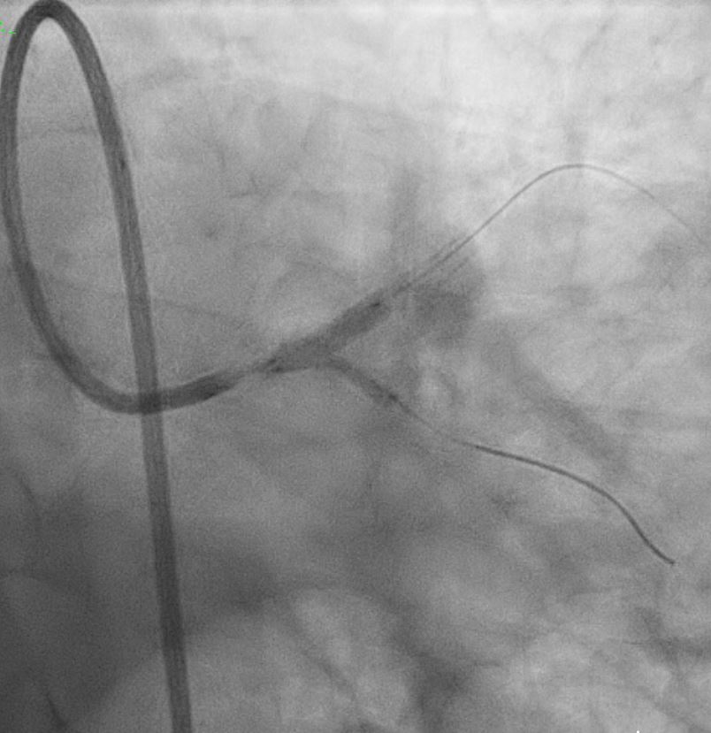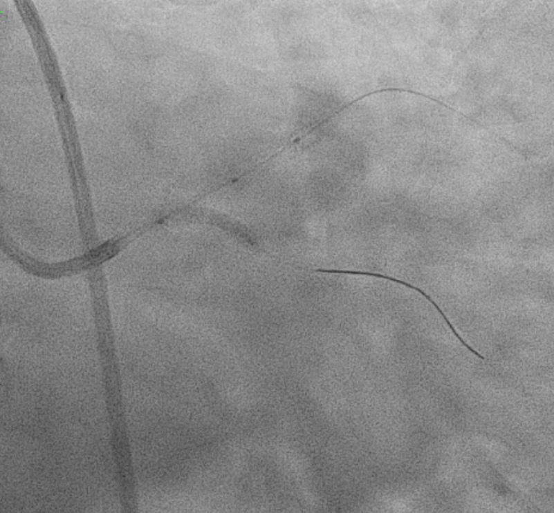 In summary, this was a complex PCI for a severely fibro-calcified ostial and proximal LAD lesion with significant calcium arc and a calcium nodule confirmed on IVUS. Despite initial right radial access with a Slender 6/7 Fr system, guide support with EBU 3.5 and later EBU 3.0 remained suboptimal, ultimately necessitating conversion to a right femoral 7 Fr approach for adequate support. Overall, the case highlights the importance of adaptive access strategy, aggressive plaque modification, IVUS-guided optimization, and bifurcation management to achieve an excellent final physiological and angiographic result in a heavily calcified LM–LAD lesion.