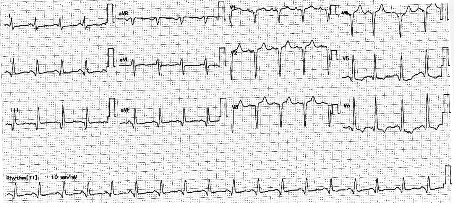 Electrocardiogram showed poor R wave progression and inferior leads Q wave. Cardiac enzymes were elevated. Echocardiogram showed severely impaired LVEF at 20% with multiple regional wall hypokinesia.