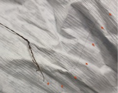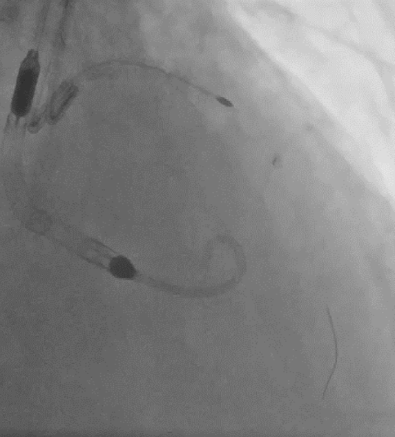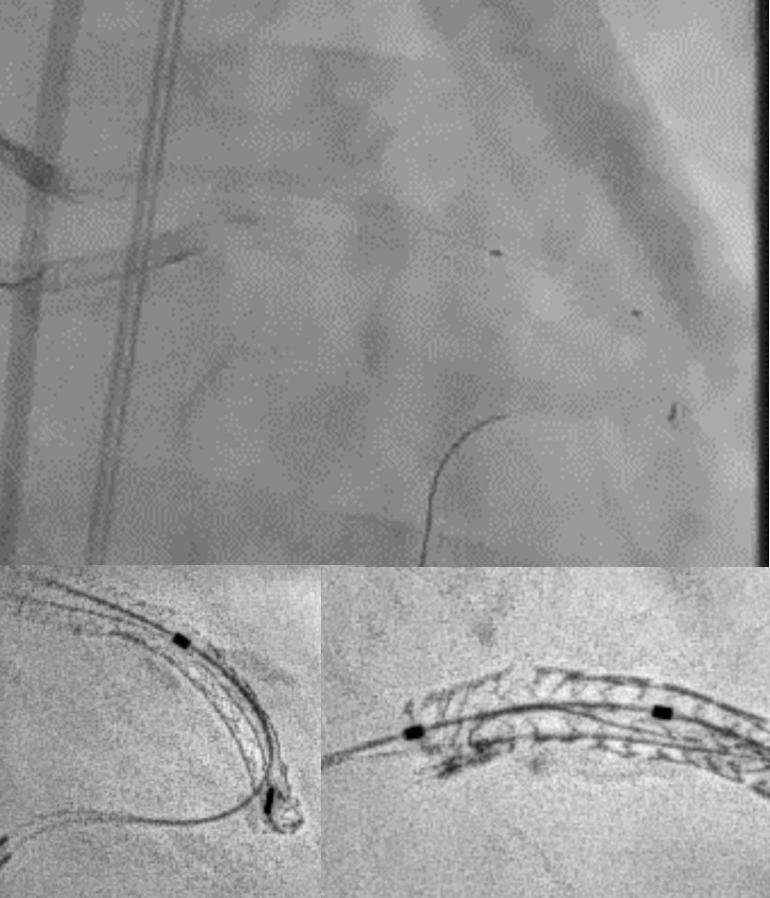 Upon removal of the workhorse wire from distal LAD, an unforeseen nightmare started. The wire tip entangled with the distal stent edge. Turnpike microcatheter was used to retrieve the stuck wire. Unfortunately, upon pullback, the wire fractured and only its proximal part was retrieved. The distal part remain stuck in the distal stent edge and uncoiled with filaments extending from stent edge into aorta. PingPong guiding was immediately set up. ClearStent showed distal stent edge deformity which rendered passage of any device including 1.0mm balloon impossible. In order to modify the obstructing stent struts at distal edge, it was decided to use rotablation. Direct wiring across the deformed distal stent edge with rota wire was successful. Pecking motion of rotablation was performed with the aim to clear the obstructing scaffolds. After 25 runs at high speed with 1.5bur, the deformed distal stent was successfully crossed. The trapped wire tip was unexpectedly released and fell into the septal branch. The fractured filaments were assessed with IVUS and ClearStent. Subsequently, the filaments were all retrieved with 2 twisting wires. IVUS confirmed complete clearance of any filament. The LM-LAD stent was again post dilated and optimized. Final angiogram and follow up restudy 4months later both showed satisfactory result with patent stents.