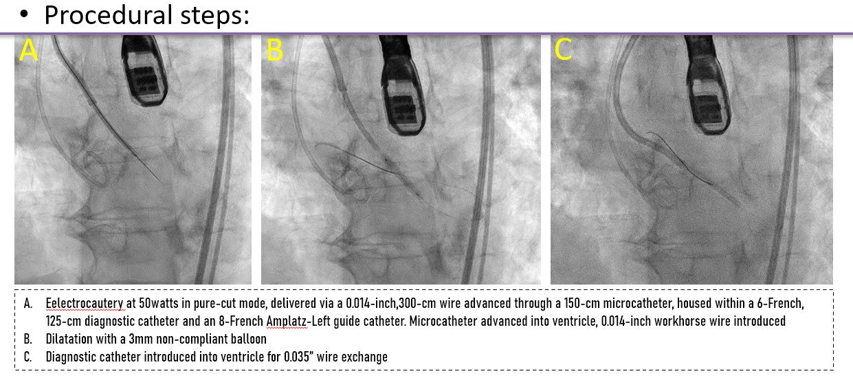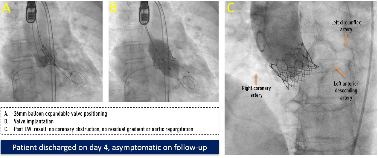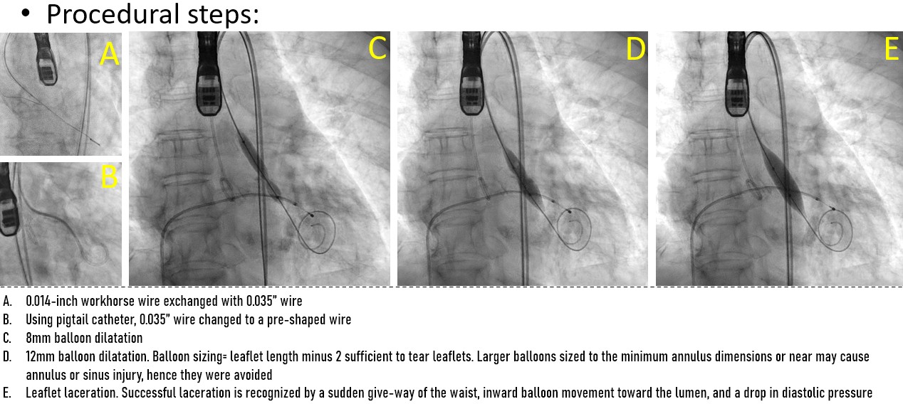 A controlled laceration of the native left coronary cusp was planned under general anaesthesia. A puncture point 2 mm above the cusp base, aligned with the coronary ostium, was selected to ensure optimal leaflet splay and minimise recoil risk following laceration. Leaflet traversal was performed using electrocautery at 50 W in pure-cut mode, delivered through a 0.014-inch, 300-cm Astato wire (ASAHI) advanced via a 150-cm Finecross microcatheter (Terumo), housed within a 6-French, 125-cm multipurpose diagnostic catheter and an 8-French Amplatz Left guide catheter. After advancing the microcatheter into the left ventricle, the Astato wire was exchanged for a 0.014-inch Fielder wire. Initial dilatation was performed using a 3 mm non-compliant Apollo balloon (BrosMed Medical). The Fielder wire was then exchanged for a 0.035-inch, 260-cm J-tip wire, and subsequently for a pre-shaped Safari wire (Boston Scientific). Based on procedural planning, a balloon size equal to or up to 2 mm shorter than the leaflet length was deemed adequate to achieve effective laceration while avoiding sinus or annular injury. Controlled leaflet laceration was performed using sequential balloon dilatations with an 8-mm Armada balloon (Abbott Cardiovascular) followed by a 12-mm Mustang balloon (Boston Scientific). Successful laceration was indicated by a sudden give-way of the balloon waist, inward balloon shift toward the lumen, and a drop in diastolic pressure. A balloon-expandable valve was implanted.